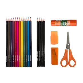 O Kit Escolar Leo&Leo é completo, perfeito para atividades extras ou escolares. Ele possui 6 componentes: caixa de lápis 12 cores, 4 lápis grafite hb, 1 apontador com depósito para resíduos, 1 tesoura plus, 1 borracha com cinta e 1 cola bastão de 10g.