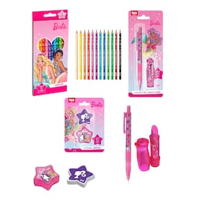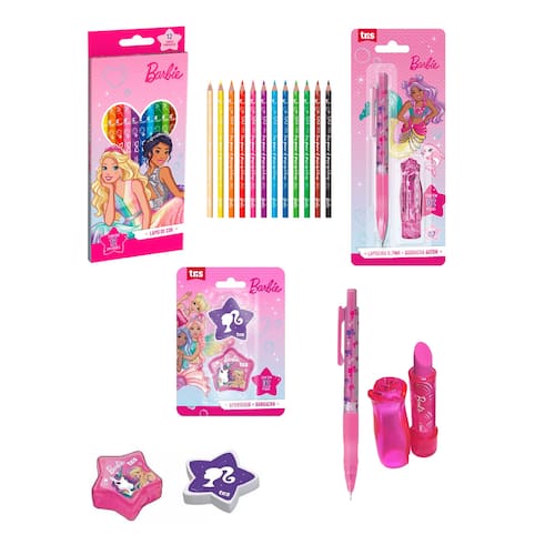 Kit Escolar Barbie 15pcs Lápis de Cor, Lapiseira, Apontador, Borracha