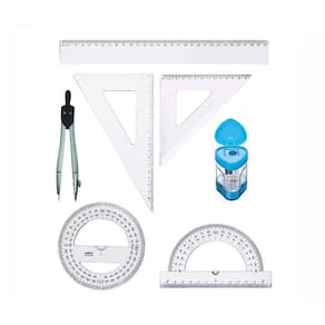 Kit Material Escolar Geométrico 1 Compasso escolar de metal com 2 grafites extra 2 Transferidor 360º e 180º 1 Régua 30cm 2 Esquadro 45º e 60º 1 Apontador com deposito e borracha Ean: 0789593736403