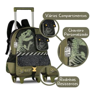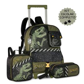O Kit Escolar Infantil Dinossauro com Mochila de Rodinhas com Lancheira e Estojo foi pensado para trazer praticidade, conforto e muito estilo para o dia a dia escolar dos meninos. A Mochila de Rodinhas TX25026K é confeccionada em poliéster resistente com detalhes em ripstop, estampa exclusiva de dinossauro e chaveiro personalizado que dá um charme especial. Possui compartimento principal espaçoso com fechamento em zíper, além de dois bolsos frontais para manter o material sempre organizado. Nas laterais, conta com bolsos telados ideais para garrafinhas. Suas rodinhas traseiras resistentes e base de apoio frontal oferecem estabilidade, enquanto o puxador em alumínio facilita o transporte. Também pode ser utilizada nas costas, já que possui alças ajustáveis e acolchoadas, além de alça de mão superior. Dimensões aproximadas: 40x30x13cm. A Lancheira Térmica TX25028L traz praticidade para os lanches da escola, mantendo os alimentos bem conservados graças ao revestimento térmico. Produzida em poliéster com frente em telado duplo, possui fechamento em zíper, alça de costas ajustável, alça de mão superior e alça carona que permite acoplar facilmente na mochila de rodinhas. Dimensões aproximadas: 23x20x11cm. O Estojo TX25029E complementa o kit com muito espaço interno para armazenar lápis, canetas, borrachas e outros itens escolares. Confeccionado em poliéster, possui frente em telado duplo, puxador de zíper personalizado e alça de mão para facilitar o uso. Dimensões aproximadas: 21x9x6cm. Com design moderno e tema de dinossauro em tons de verde, esse kit é funcional e perfeito para meninos que buscam estilo e praticidade na rotina escolar. Marca: Não Informado