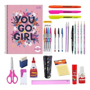 Para facilitar sua vida e para você não perder seu precioso tempo e correr o risco de esquecer de comprar algum item necessário em sala de aula montamos pra você um lindo kit escolar composto de 24 intens básicos em sala de aula. Veja abaixo oque vai no seu kit:Descrição dos itens inclusos - Marcas conhecidas e de excelente qualidade1 Lindo caderno 10 matérias capa dura feminina3 Lindos Marca texto cores sortidas1 Blister com 4 canetas jet lux 3 Canetas esferográficas2 Canetas gel1 Lapiseira4 Lápis com borracha1 Tesora escolar1 Borracha com capa plástica1 Apontador com depósito1 Tubo de cola1 Régua 30 cm1 Bloco de notas adesivado1 Corretivo líquido1 Tubo de cola BastãoBoas Compras !Deus é fiel