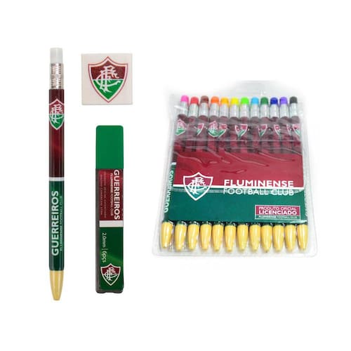 Incrível jogo escolar com uma lapiseira grafite 2B de 2.0 mm, borracha e 6 grafites para lapiseira, jogo contendo 12 lapiseiras de cor 2 mm tudo com a cor e customização do time. O topo da lapiseira ainda funciona como um apontador para o grafite, mantendo a ponta da lapiseira sempre pronta para escrever. Material: plástico