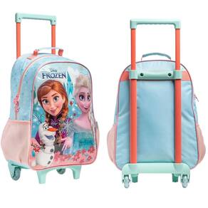 Mochila com rodinhas: a mochila com rodinhas frozen é perfeita para acompanhar as pequenas com a magia de arendelle, unindo funcionalidade, conforto e charme disney. Frente em pvc vincado com glitter para arte vibrante que brilha, zíper tratorado com puxadores em metal personalizados para praticidade refinada. Alça de mão em poliéster com cadarço para transporte confortável, carrinho com hastes achatadas e rodinhas em gel para suavidade. Produzida em poliéster resistente para aventuras escolares com estilo