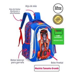 A mochila de costas é produzida em poliéster, um material muito resistente, e possui um painel frontal em PVC, que facilita a limpeza do produto. Com um bolso frontal embutido com puxador de zíper personalizado, a mochila oferece espaço para guardar os materiais escolares de forma organizada. Além disso, conta com alça de mão reforçada e alça de costas ajustável, proporcionando conforto durante o transporte. Os bolsos laterais são ideais para carregar garrafinhas de água ou outros objetos pequenos. A mochila também possui um identificador no verso, onde você pode colocar o nome do seu filho.