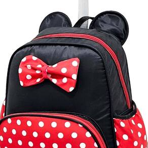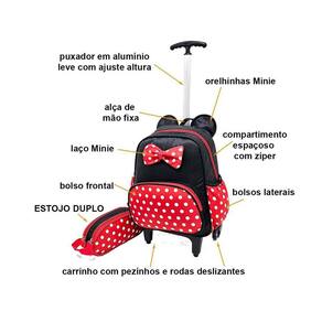 Kit Escolar Infantil Kids Laço Carrinho Estojo MC4324 Mochila Carrinho com puxador ajustável à altura da criança. Compartimento espaçoso com zíper Bolsos laterais em elásticos Bolso frontal com zíper Puxador em alumínio Carrinho com rodas deslizantes e pezinhos de apoio Acompanha estojo duplo Medidas aproximadas em cm: AxLxP 34x18x28 Altura máxima do puxador com 60cm Detalhes de orelhinhas e laço poá Ean: 0789356471534