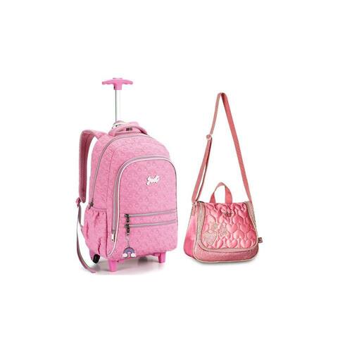 Kit Escolar Meninas RS Mochila de Rodas e Costas + Lancheira - Produzida em poliéster; - Possui alças para costas macias e confortáveis; - Possui 2 bolsos laterais, 2 frontais e 1 divisão grande; - Zíperes com puxadores reforçados; - Rodinhas produzidas em pvc gel de altíssima resistência; - Puxador do carrinho produzida em alumínio e pvc; - Estampa estilizada; - Alça para mão; - Dimensões da mala: 42 x 32 x 21 cm alt x larg x prof ; Lancheira - Produzida em poliéster; - Forro interno em pvc; - Estampa estilizada; - Zíperes com puxadores reforçados; - Alça para mão; - Dimensões: 23 x 24 x 15 cm alt x larg x prof ; - Não Acompanha garrafinha e porta lanche ;