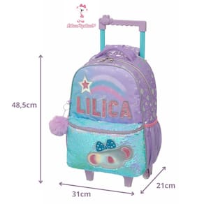 Ideal para transportar os materiais escolares com facilidade e conforto. A mochila possui rodinhas que deslizam suavemente em qualquer terreno, alça rígida e alças acolchoadas, garantindo praticidade para crianças de todas as idades. Feita em poliéster resistente, tem compartimentos organizados e zíperes reforçados, perfeitos para manter os pertences seguros e acessíveis. Seu design lilás com detalhes divertidos e vibrantes conquista de imediato, oferecendo um toque de exclusividade.