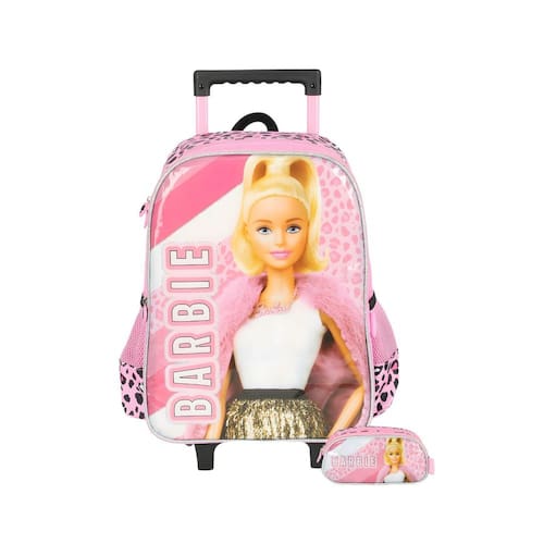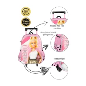 Kit Escolar Mochila de Rodas+Estojo Barbie Mochila com Rodas: Confeccionada em Poliéster Fechamento em zíper Puxadores personalizados Compartimentos espaçosos 2 bolsos laterais para garrafa Possui RODAS e ALÇA DE MÃO Design exclusivo Etiqueta de identificação na parte traseira Medidas aproximadas: Altura: 45 cm Largura: 15 cm Comprimento: 30 cm