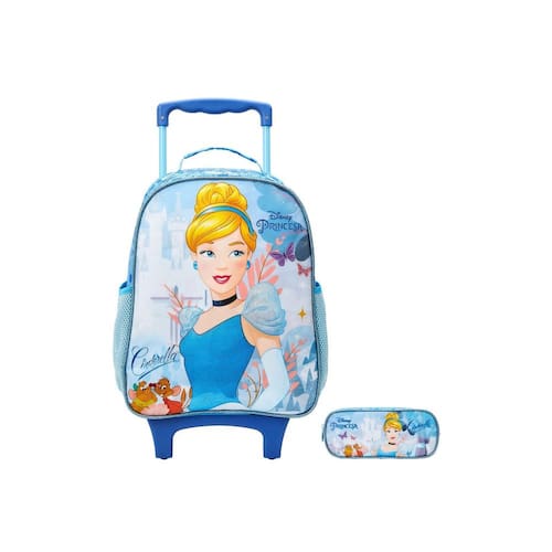 Design da Cinderela com brilho: Todos os itens possuem um design exclusivo com a personagem favorita das crianças e detalhes brilhantes que encantam. Mochila de rodinha: Facilita o transporte dos materiais escolares e proporciona mais conforto para a criança. Estojo simples: Espaço suficiente para organizar lápis, canetas e outros materiais. Zíper resistente: Garante maior durabilidade e segurança em todos os itens. Bolsos laterais: Ideais para guardar garrafinhas ou outros objetos pequenos. Alça de mão: Versatilidade para carregar a mochila Detalhes personalizados: Tornam o kit ainda mais especial e único.