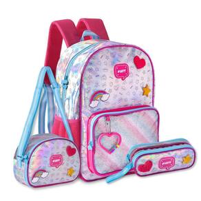 Kit Mochila de Costas HL24564 + Lancheira Térmica HL24568 + Estojo HL24569 Proporcione praticidade, estilo e organização para o dia a dia escolar da sua filha com o Kit Escolar Holográfico. Perfeito para meninas estilosas e moderninhas, este kit combina design moderno, funcionalidade e qualidade incomparável. Mochila de Costas HL24564: Com compartimento principal espaçoso, essa mochila é ideal para guardar livros, cadernos e materiais escolares maiores. O bolso frontal com fechamento por zíper é perfeito para itens menores, como estojos ou agendas, garantindo fácil acesso. Possui dois bolsos laterais telados, ideais para carregar garrafinhas ou pequenos objetos com segurança. As alças são ajustáveis e acolchoadas, proporcionando conforto mesmo quando a mochila está cheia. Os puxadores de zíper são personalizados, agregando charme ao design. Dimensões aproximadas: 40x30x13 cm.