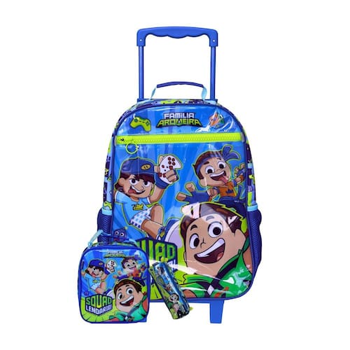 Mochila de Rodas Escolar Produzido em poliéster 1 divisão grande 1 bolso de redinha Ziperes com puxadores personalizados Estampa estilizada Lancheira Escolar Térmica Família Arqueira Time Aventura Produzido em poliéster Possui alças de costas Material interno térmico Ziperes com puxadores personalizados Estampa estilizada Não acompanha potinho e garrafinha Dimensões: 22 x 20 x 8cm alt x larg x prof