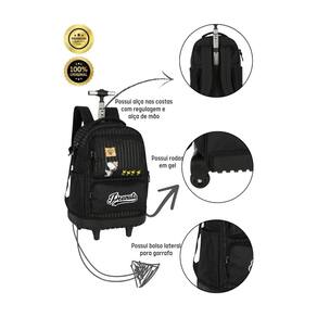 Mochila de rodas: Confeccionada em poliéster Costura reforçada para melhor duração Compartimento para notebook Alça de mão e costas acolchoadas Fechamento em zíper personalizado Carrinho com regulagem de altura e botão para travamento Compartimentos espaçosos 2 bolsos laterais para garrafa Medidas aproximadas do produto: altura: 48cm com as rodinhas e sem a haste levantada . Largura: 30cm. Profundidade: 20cm. Lancheira: Confeccionada em poliéster Isolamento térmico Alça de mão Alça que prende na mochila de rodinhas Design exclusivo Puxadores personalizados Fechamento em zíper Medidas aproximadas: Altura: 18 cm Largura: 8 cm Comprimento: 22 cm