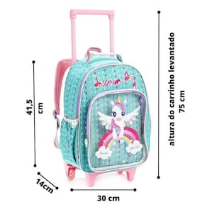 A mochila de rodinhas possui excelente qualidade e é composta por 60% poliéster e 40% PVC. Suas rodinhas de silicone de alta resistência garantem uma locomoção suave e sem dificuldades. Além disso, as alças são reforçadas, as alças de ombro são acolchoadas e a alça de mão também é acolchoada, proporcionando conforto durante o uso. Os puxadores de zíper são personalizados, e a mochila ainda conta com um identificador no verso. As medidas aproximadas da mochila são 40,5cm x 30cm x 14cm, e sua altura total, com a haste puxada, é de 75cm.