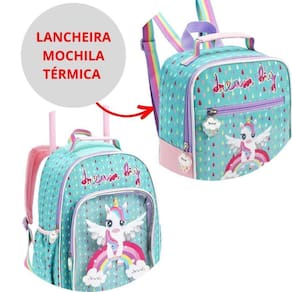 A lancheira do kit é composta por 70% poliéster e 30% PVC e possui sistema térmico, garantindo que os alimentos sejam mantidos frescos por mais tempo. Além disso, conta com alça nas costas para facilitar o transporte, identificador no verso, elástico interno para fixação da garrafa e elástico nas costas para fixação ao carrinho. A lancheira possui certificação do Inmetro e suas medidas aproximadas são 22cm x 19cm x 11cm.