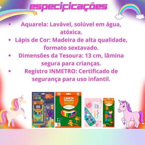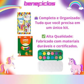 BenefíciosCriatividade Sem Limites: Aquarela e lápis de cor para desenhos e pinturas vibrantes.Praticidade e Funcionalidade: Acessórios como apontador, tesoura e borracha facilitam o dia a dia.Materiais Seguros: Produtos atóxicos, ideais para crianças.Completo e Organizado: Tudo que você precisa em um único kit.Alta Qualidade: Fabricado com materiais duráveis e certificados.Especificações TécnicasAquarela: Lavável, solúvel em água, atóxica.Lápis de Cor: Madeira de alta qualidade, formato sextavado.Canetas Hidrográficas: Traço de 1,5 mm, ponta de poliéster.Dimensões da Tesoura: 13 cm, lâmina segura para crianças.Registro INMETRO: Certificado de segurança para uso infantil.CaracterísticasAquarela: 12 cores laváveis com pincel e tampa godê para misturas.Lápis de Cor: Caixa com 12 cores vibrantes e resistentes.Lápis Grafite: 2 unidades HB estampados com borracha na ponta.Canetas Hidrográficas: 12 cores vivas com corpo na cor da tinta.Tesoura: 13 cm, segura e funcional.Apontador: Com depósito para maior praticidade.Borracha: Em formato de flor, divertida e eficiente.Cola Bastão: 10 g, ideal para colagens rápidas e limpas.Detalhes do Produto