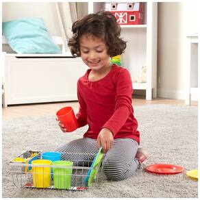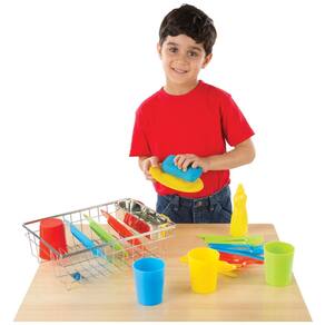 Este conjunto de pratos para lavar e secar é ideal para banquetes de playfood e festas de mentira. Ele inclui quatro pratos de plástico, quatro copos de plástico, quatro garfos, colheres e facas de plástico, um frasco de sabão espremível, uma esponja coberta de malha e um escorredor de metal com um suporte para utensílios. As peças são coloridas em vermelho, verde, azul e amarelo e são próprias para lava louças. Elas são feitas de materiais de alta qualidade e são livres de arestas afiadas que possam machucar os dedos minúsculos. Este conjunto é um presente excepcional para crianças de 3 a 6 anos e promove a imaginação e habilidades de pensamento criativo. Ele funciona bem com uma de nossas cozinhas de brincar ou pode ser utilizado como um conjunto de brincar independente. A Melissa Doug tem fornecido consistentemente produtos inovadores que inspiram o pensamento aberto, incentivam as crianças a ver novas possibilidades e oferecem inúmeras maneiras de brincar.