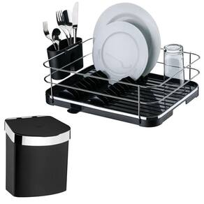 O Escorredor de Louças possui bico fixo para vazão da água. Você direciona essa saída de água para dentro da cuba e a pia fica sempre seca. Tem capacidade para 11 pratos e um porta talheres removível, que pode ser posicionado onde for mais conveniente. É fabricado em plástico e aço carbono, com detalhe em aço piatina cromado (aço em formato achatado).