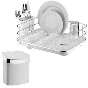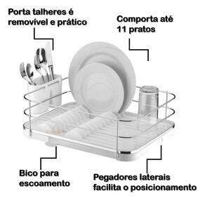 O Escorredor de Louças possui bico fixo para vazão da água. Você direciona essa saída de água para dentro da cuba e a pia fica sempre seca. Tem capacidade para 11 pratos e um porta talheres removível, que pode ser posicionado onde for mais conveniente. É fabricado em plástico e aço carbono, com detalhe em aço piatina cromado (aço em formato achatado).