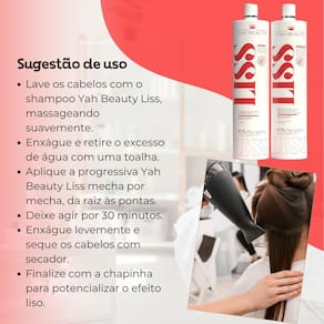 Sugestão de uso: - shampoo: aplique nos cabelos molhados, massageando suavemente o couro cabeludo. Enxágue abundantemente. - progressiva: após lavar os cabelos com o shampoo, aplique a progressiva mecha a mecha, respeitando o tempo de pausa indicado no produto. Enxágue e finalize como desejar.