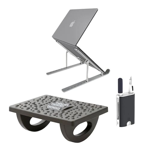 kit home office, kit escritório, kit escritório ergonômico, kit home office ergonômico, acessórios para escritório, acessórios para home office, apoio ergonômico para pés, suporte para notebook, limpeza de eletrônicos, limpa telas, extensão elétrica, organização de escritório, conforto para trabalho, estação de trabalho, kit produtividade
