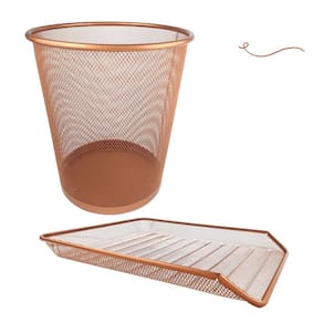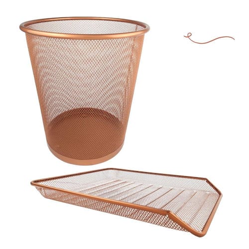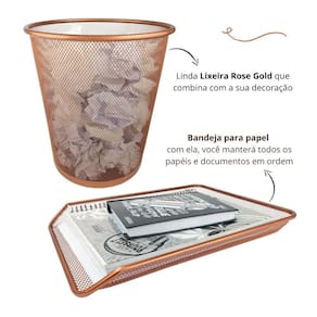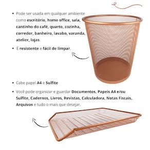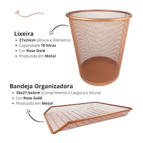 Kit Escritório Lixeira Aramada e Bandeja Organizadora de Papel Rose Gold Você que precisa de um ambiente elegante, moderno e com um toque diferenciado. O kit escritório Rose Gold de lixeira e bandeja de papel irá fazer isso para o seu ambiente. Elas decoram e deixam o ambiente moderno, aperfeiçoando o espaço útil e possibilitando o uso em diversas situações e lugares. KIT ESCRITÓRIO COMPOSTO POR: - 01 LIXEIRA ESCRITÓRIO ROSE GOLD - 01 BANDEJA ORGANIZADORA DE PAPEL Cor: ROSE GOLD Material: METAL TAMANHOS: - LIXEIRA ESCRITÓRIO ROSE GOLD Tamanho: 27x24cm (Altura x Diâmetro) Capacidade: 10L - BANDEJA ORGANIZADORA DE PAPEL Tamanho: 35X27,5X4cm (Comprimento x Largura x Altura) Cabe papel A4 e Sulfite