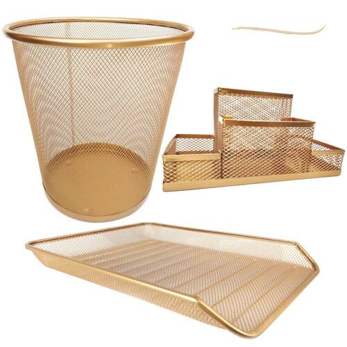Kit Escritório Dourado Para quem gosta de ter tudo sempre à mão, com agilidade e praticidade. Kit de organizadores de escritório é ideal para você. Com eles, você vai evitar a perda de tempo procurando os itens de que precisa e que usa com frequência. Tudo estará a sua mão. KIT ORGANIZADORES DE ESCRITÓRIO PRETO COMPOSTO POR: - 01 Lixeira AramadaDourado10L - 01 Bandeja Organizadora SimplesDourado - 01 Organizador de Mesa com 4 partiçõesDourado Cor: DOURADO OURO Material: METAL TAMANHOS: - Lixeira Tamanho: 27x23,5x18,5cm (Altura x Diâmetro da boca x Diâmetro da base) - Bandeja Organizadora de Mesa Tamanho: 4x27,5x35cm (Altura x Largura x Comprimento) -Organizador de Mesa com 4 partições Dourado Tamanho: 20x10x10cm (Largura x Comprimento x Altura)