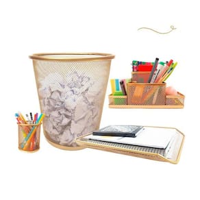 Kit organizadores de escritório dourado composto por: - 01 lixeira aramada dourado 10l - 01 bandeja organizadora simples dourado - 01 organizador de mesa com 4 partições dourado - 01 porta caneta dourado