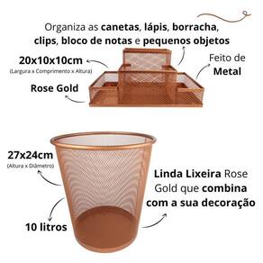Kit organizadores de escritório rose gold composto por: - 01 lixeira aramada rose gold 10l - 01 bandeja organizadora simples rose gold - 01 organizador de mesa com 4 partições rose gold - 01 porta caneta rose gold
