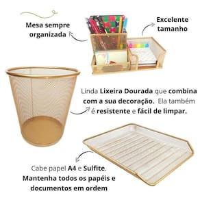 Kit escritório lixeira, organizador de mesa, bandeja organizadora dourado ouro Kit escritório lixeira, organizador de mesa, bandeja organizadora dourado ouro