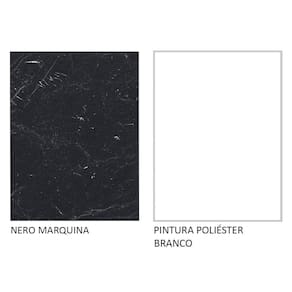 A mesa possui acabamento em preto Nero Marquina no tampo e o gaveteiro tem acabamento branco. Ambos são feitos em Pintura Poliéster ecológica com 7 camadas de proteção.
