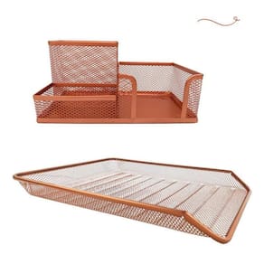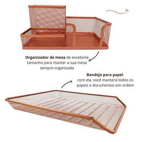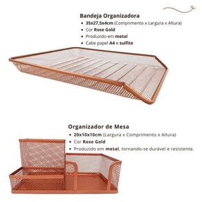 Kit escritório organizador de mesa, bandeja rose gold Kit escritório rose gold Para quem gosta de ter tudo sempre à mão, com agilidade e praticidade. Kit de organizadores de escritório é ideal para você.Com eles, você vai evitar a perda de tempo procurando os itens de que precisa e que usa com frequência. Tudo estará a sua mão. Kit escritório composto por:- 01 bandeja organizadora simples rose gold- 01 organizador de mesa com 3 partições rose gold Cor: rose goldMaterial: metal Tamanhos: - bandeja organizadora de mesa tamanho: 4x27,5x35cm altura x largura x comprimento - organizador de mesa com 3 partições rose gold tamanho: 20x10x10cm largura x comprimento x altura Marca: Markys Store