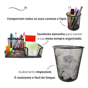 Para quem gosta de ter tudo sempre à mão, com agilidade e praticidade. Kit completo de organizador, porta canetas e lixeira de escritório é ideal para você. Com eles, você vai evitar a perda de tempo procurando os itens de que precisa e que usa com frequência. Tudo estará a sua mão.