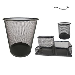 Kit escritório preto composto por: - 01 organizador de mesa escritório preto com 3 partições - 01 porta caneta, lápis preto - 01 lixeira aramada preto