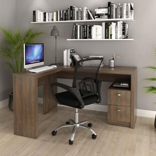 Mesa Escritório de canto Tecnomobili ME4129, possui 2 gavetas com amplo espaço para armazenar documentos, objetos pessoais e/ou acessórios, material em MDP, acabamento em BP, possui costas na cor do móvel. A cadeira tem estrutura em poliuretano de altíssima qualidade, que proporciona muito mais resistência, mesmo com o passar dos anos. O acabamento em verniz deixa o móvel mais bonito e dá mais destaque a decoração de toda a casa. Essa cadeira tem design versátil, assento confortável e vem com kit de montagem, para tudo ficar mais rápido e prático. Ela suporta até 120 kg de peso máximo, que dá mais tranquilidade ao sentar e tem 4 pés com rodízios em PU que não arranham o piso do cômodo. Acabamento: BP Altura do Conjunto: 85 cm Ambiente: Escritório Ambiente Principal: Escritório Cor: Rústico Informação Complementar: 1x Mesa para Escritório em L 2 Gavetas Me4129 Rústico Largura: 135,8 cm Altura: 74,5 cm Peso: 32,4 kg Profundidade: 113 cm Necessita Montagem: Sim