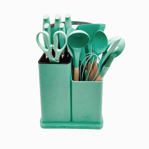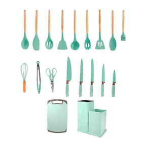 1x Colher para espaguete 1x Escumadeira 1x Espátula vazada 1x Espátula lisa 1x Colher 1x Concha 1x Colher rasa 1x Espátula raspadora 1x Pincel 1x Pinça / pegador 1x Fouet 1x Faca de Chef 1x Faca de Pão 1x Faca Universal 1x Faca de Utilidades 1x Faca de Fruta 1x Tesoura 1x Tábua de corte 1x Cachepô Porta Utensílios