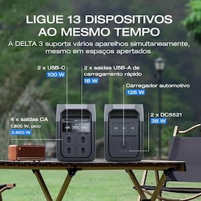 A Estação de Energia Portátil EcoFlow DELTA 3 é indicada para fornecimento de energia elétrica em diferentes aplicações, como uso residencial, viagens, camping, motorhome (RV) e atividades profissionais. Possui bateria interna recarregável, múltiplas entradas de carregamento e saídas para alimentação de equipamentos elétricos e eletrônicos.