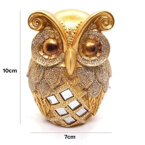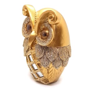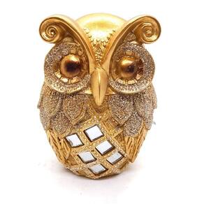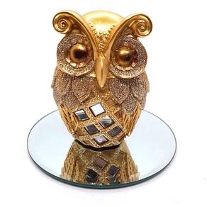 Enfeite decorativo no formato de uma coruja com aproximadamente 10 cm de altura e corpo fartamente decorado acompanhado de uma linda bandeja espelhada redonda de 12 cm que vai abrilhantar qualquer ambiente. Ideal para decoração de interiores.