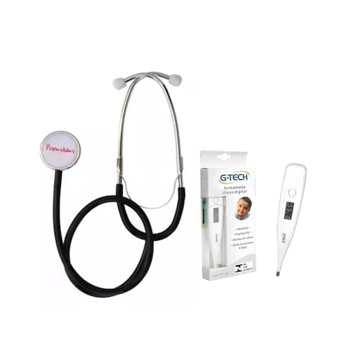 ESTETOSCÓPIO SIMPLES ADULTO - Baixo peso; - Diafragmas de alta sensibilidade; - Tubo moldado em PVC de peça única para melhor transmissão do som. ESPECIFICAÇÕES TÉCNICAS - Cor: Preto; - Para uso adulto. Termômetro Digital Axilar Com Ponta Rígida Branco Medição digital Características Gerais: - Visor digital de fácil visualização - Bateria de longa duração (Inclusa) - Local de medição: boca e axila - Memória Última medição - Tempo de medição 60 a 120 segundos - Alarme após a medição - Cor Principal: Branco