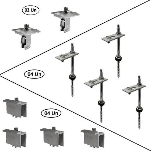Composição do kit: Suporte fabricado em alumínio e aço inox para fixação em vigas de madeira Este suporte de fixação permite ótimo custo x benefício, pois é fixado na estrutura do telhado, dispensando estrutura extra para fixação. Fabricado em aço inoxidável e alumínio de alta resistência e durabilidade para todos os padrões climáticos, este suporte foi desenvolvido especialmente para fixar a estrutura em alumínio de sustentação dos painéis solares em vários tipos de telhados, sem a necessidade de alteração na estrutura. Utilizando materiais não ferrozos é ideal para todo tipo de região, sendo resistente inclusive, à maresia do litoral. Possui 2 regulagens de altura devido a sua rosca dupla, se adaptando a todo tipo de telhas e permitindo perfeito nivelamento das placas.