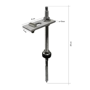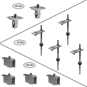 Composição do kit: Suporte fabricado em alumínio e aço inox para fixação em vigas de madeira Este suporte de fixação permite ótimo custo x benefício, pois é fixado na estrutura do telhado, dispensando estrutura extra para fixação. Fabricado em aço inoxidável e alumínio de alta resistência e durabilidade para todos os padrões climáticos, este suporte foi desenvolvido especialmente para fixar a estrutura em alumínio de sustentação dos painéis solares em vários tipos de telhados, sem a necessidade de alteração na estrutura. Utilizando materiais não ferrozos é ideal para todo tipo de região, sendo resistente inclusive, à maresia do litoral. Possui 2 regulagens de altura devido a sua rosca dupla, se adaptando a todo tipo de telhas e permitindo perfeito nivelamento das placas.