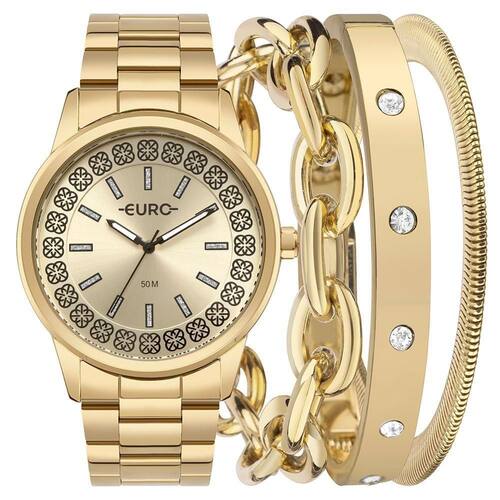 Kit Euro Feminino Soul Dourado - Eu2035yvy/k4d Explore a linha Glitz, com um relógio com caixa sofisticada que traz a tendência da logomania com um toque moderno e diferenciado. Cor da Caixa - Dourado Material da Caixa - Aço Formato da Caixa - Redondo Material da Pulseira - Aço Tipo de Fecho - Trava Lateral Garantia - 12 meses Cor do Mostrador - Dourado Cor da Pulseira - Dourado Largura da Caixa (cm) - 4,2 Resistente a Água - 5 ATM Descrição da Resistência - A resistência deste produto permite apenas respingos de água ao lavar as mãos. Não utilizar este produto em qualquer situação que haja contato direto com água. Modelo_ML - Kit Relógio Euro Feminino Soul Dourado - EU2035YVY/K4D plaintext_description_meli - Kit Relógio Euro Feminino Soul Dourado - EU2035YVY/K4DExplore a linha Glitz, com um relógio com caixa sofisticada que traz a tendência da logomania com um toque moderno e diferenciado. meli_title - Kit Relógio Euro Feminino Soul Dourado - EU2035YVY/K4D Cor - Dourado Tamanho - Grande Gênero - Feminino