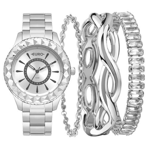Realce sua presença e individualidade com o kit Euro Soul! Com design moderno, esse conjunto traz relógio com aro trabalhado em spikes na elegante versão prata, acompanhando um kit de pulseiras fashion que complementam seu estilo. Perfeito para mulheres que querem expressar sua singularidade com charme e atitude.