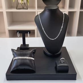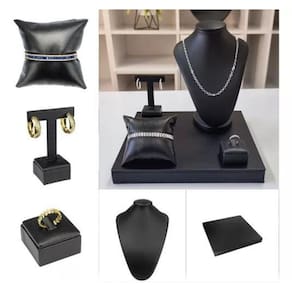 Kit Expositor para Joias Corino Preto Alto 5 Peças luxo Kit de expositores composto por 05 peças: - 1 Busto Expositor de Colar para Fotografia 25 cm ; - 1 Almofada de Napa 8 x 8 cm; - 1 Expositor para Joias em Corino Base Pequena; - 1 Expositor de Joias em Corino para Brinco T Médio; - 1 Expositor de Joias em Corino para Anel; - Expositores de joias para lojas, fotografias e venda de joias em redes sociais. Ideal para expor suas peças e agregar valor. - Display e Stand em Corino ou camurça para fotografia. Joias não inclusas. Marca: Lagjoalheiros
