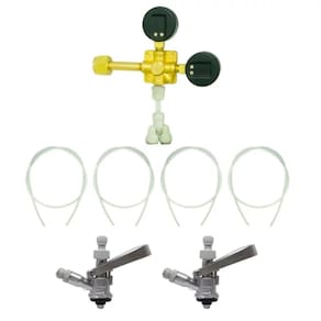 O KIT 2 Vias é composto por: 1 Válvula Redutora de Pressão com Manômetro e Engate Rápido de 2 Saídas 2 Válvulas Extratora Keg P Inox com Engate Rápido 4x (1,5m) - Tubo Polietileno 3/8 engate rápido para Chopp