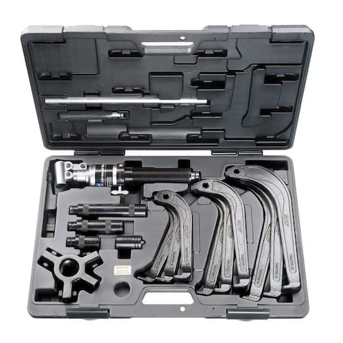 O TMHP 10E é um kit extrator completo para a desmontagem de rolamentos. O kit inclui três conjuntos de braços diferentes que podem ser usados em uma configuração de dois ou três braços. O extrator usa um eixo-árvore hidráulico para a desmontagem fácil com forças de desmontagem de até 100 kN (11,2 t). Com um curso de 80 mm (3,1 pol.), o eixo-árvore facilita a desmontagem em uma operação. A segurança é apoiada através de um braço de travamento automático que reduz o deslizamento do extrator sob carga, um ponto central carregado por mola para possibilitar a fácil centralização do eixo-árvore e uma válvula de segurança para evitar a sobrecarga do extrator.