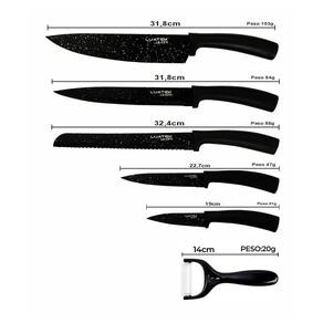 1 faca de chefe 20cm : ideal para cortes precisos e versáteis. 1 faca para pão 20cm : com serrilha afiada para cortes suaves. 1 faca para carne 20cm : projetada para cortes de carne com perfeição. 1 faca multifuncional 12,5cm : versátil e pronta para tarefas diversas. 1 faca para descascar 9cm : perfeita para descascar frutas e legumes. 1 descascador de cerâmica: precisão no descascamento para uma apresentação impecável. Qualidade superior em cada lâmina: As facas napoli são fabricadas com lâminas de alta qualidade, proporcionando durabilidade e eficiência no corte. A precisão de cada faca garante um desempenho excepcional na preparação de alimentos, tornando-as indispensáveis para chefs profissionais e amadores.