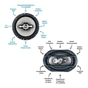 Especificações Técnicas do Alto Falantes 6x9: Potência RMS: 70W RMS (cada) Modelo Quadraxial Impedância Nominal: 4 ohms Woofer de 6x9 Polegadas Material: Cone Polipropileno BB sensibilidade: 87 Db Resposta de frequência: 37 a 20000Hz Bobina Simples Tweeter Piezzo Borda Emborrachada Cone com acabamento na cor cinza / preto