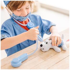 Seu filho ou filha pode se tornar um veterinário de brinquedo com este conjunto de fantasias da Melissa Doug. O conjunto inclui uma jaqueta azul lavável, máscara e touca cirúrgica, estetoscópio com efeitos sonoros, seringa, termômetro, curativo, crachá veterinário reutilizável, cachorro de pelúcia paciente e muito amor para dar. A fantasia é feita com materiais de alta qualidade e montada com padrões de fabricação precisos para garantir durabilidade.