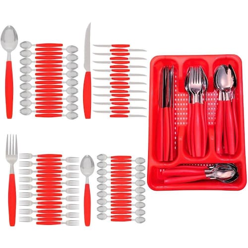 Conj de talheres + porta talher O Conjunto de talheres com porta talher é um conjunto de utensílios de mesa composto por talheres básicos, como garfos, facas, colheres e colheres de chá, acompanhados de um prático porta talheres para armazenamento e transporte conveniente. Esse conjunto é ideal para uso em casa, em viagens, acampamentos, piqueniques e outras ocasiões em que seja necessário levar os talheres consigo. Os talheres são compostos por aço inoxidável de alta qualidade e um porta talher feito de plástico durável. Os talheres são fabricados em aço inoxidável, um material conhecido por sua resistência à corrosão e durabilidade. Eles são projetados para serem resistentes e duráveis, permitindo o uso contínuo sem enferrujar ou corroer, mesmo com o contato frequente com alimentos e água.