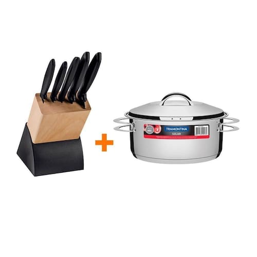 Jogo de 6 PÇ (5 pç e Suporte de Madeira Plenus) Lâminas Inox Cabos Polipropileno - Tramontina 23498028